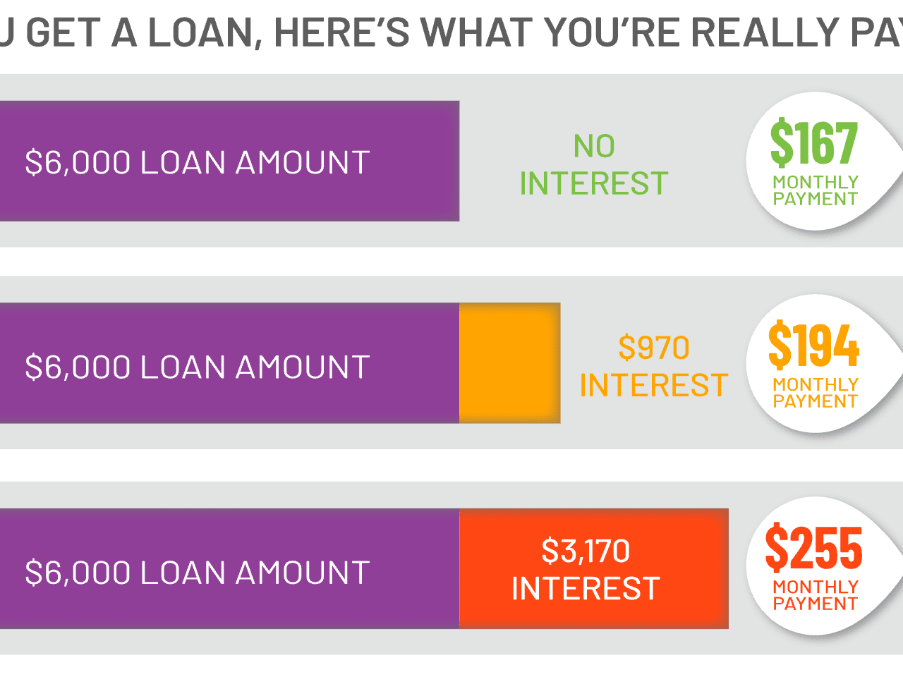 If you get a loan from any number of payday type loan outfits, or when you borrow on your credit cards, you will be charged up to 30% interest. As you can see here, on a $6,000 loan, that means you're paying $3,170 in interest. We think that is simply unfair. You just don't kick someone when they're down, you lend them a helping hand. That's why JFLA loans never charge interest. So your monthly payment is much lower and you pay off the loan sooner.